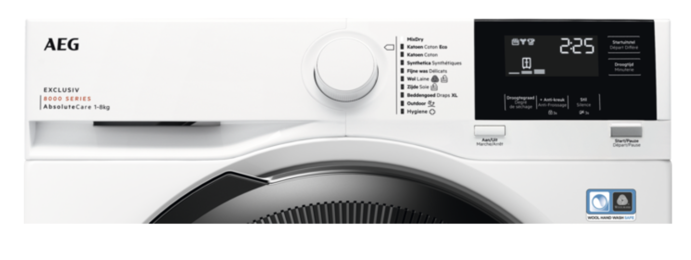 Indicatie status droogcyclus: Drogen, Afkoelen, Strijkdroog, Kastdroog, Extra