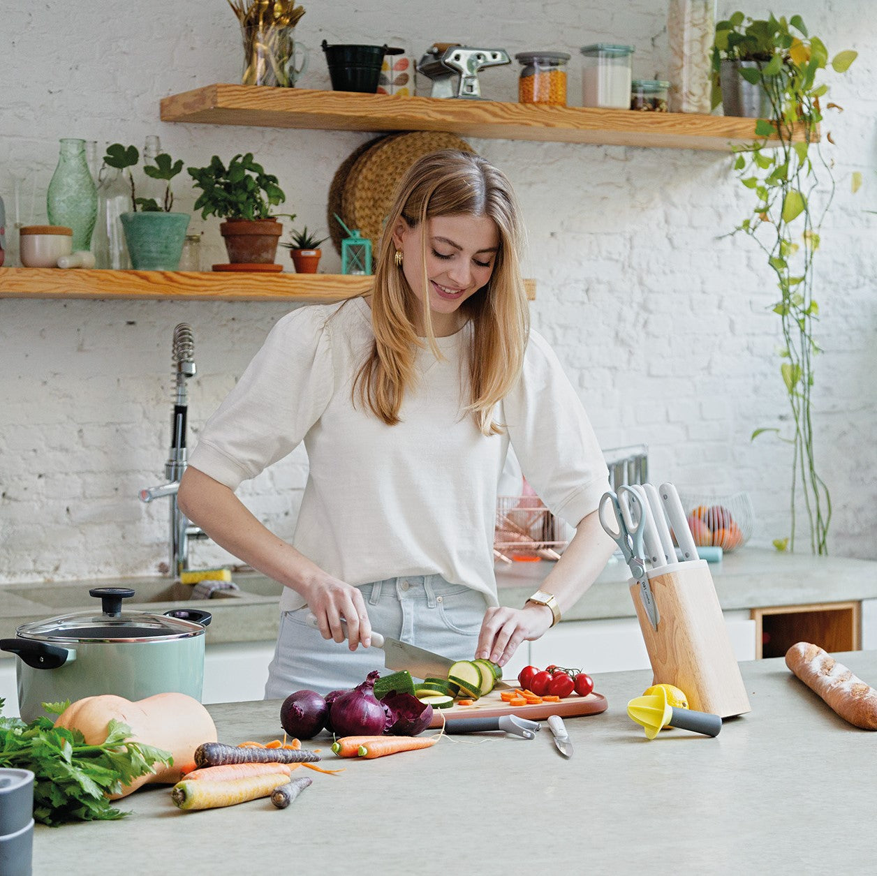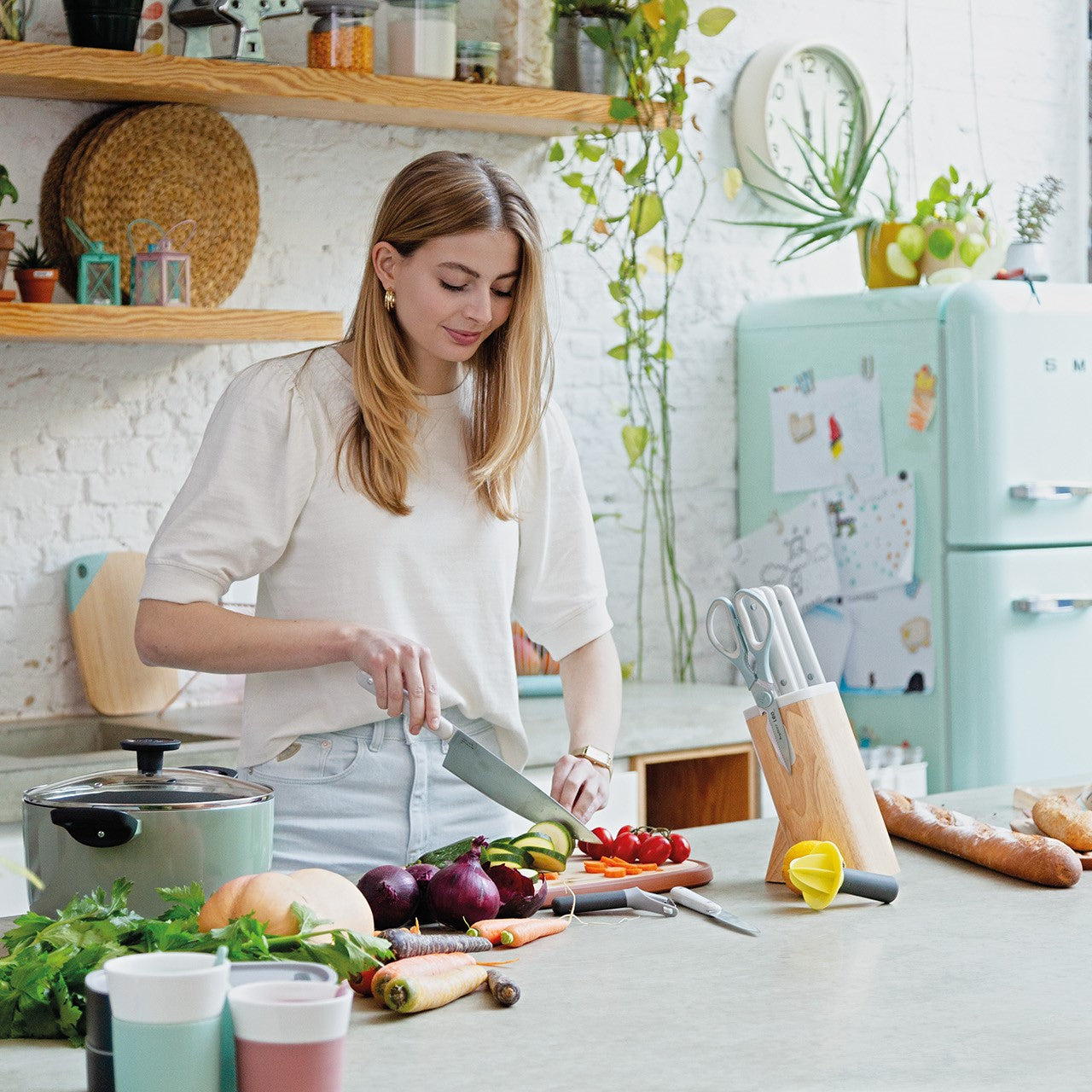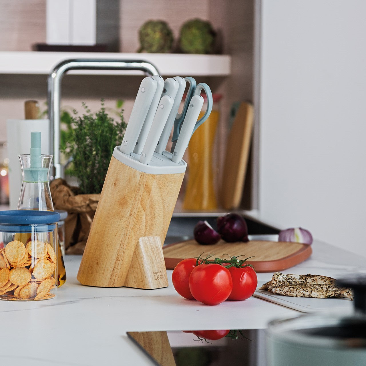 Deze 7-delige messenblok is de subtiele oplossing om wat kleur toe te voegen aan je keuken! De messenblok bevat een veelzijdig messenassortiment zoals een schilmesje, universeel mes, vleesmes, broodmes, koksmes en santokumes. In de mooi vormgegeven houten messenblok met glanzende topafwerking. De messleuven zijn zo ontworpen dat ze perfect passen op de bolster van het mes, zo ben je 100% zeker van een veilige messenopberging. De geïntegreerde magneet aan de zijkant zorgt voor een gemakkelijke opslag van uw schaar of andere magnetisch keukengerei .