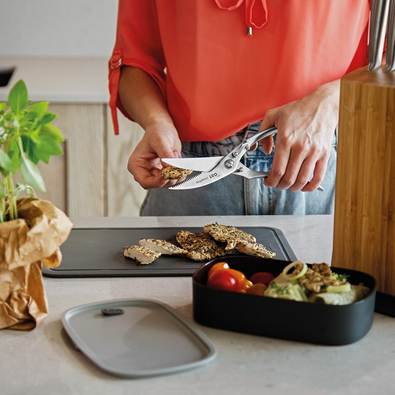 Deze gevogelteschaar is de perfecte aanvulling op het 11-delige messenblok met roestvrijstalen messen. Ze zijn een geweldig hulpmiddel voor een verscheidenheid aan keukentaken, zoals gevogelte in porties snijden, touw knippen, krabben snijden, ... met een minimale inspanning. De stijlvolle holle handgrepen van de schaar zorgen voor een comfortabele grip, terwijl de roestvrijstalen messen door de botten snijden zonder het delicate vlees te scheuren, langdurige scherpte bieden en gemakkelijk te onderhouden zijn.