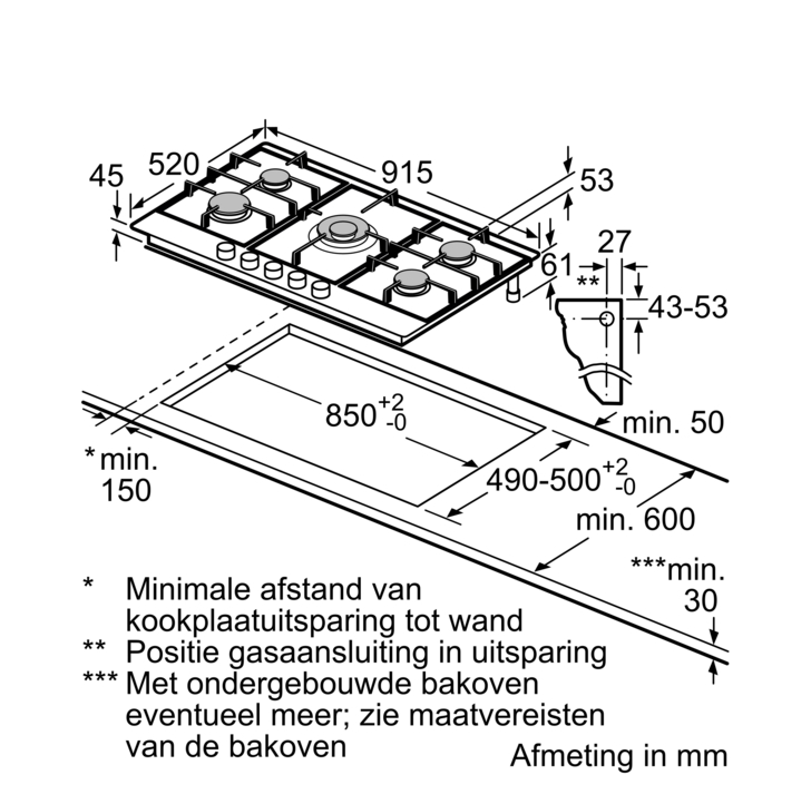 - Inbouwafmetingen (HxBxD) : 45 x 850 x (490 - 500)