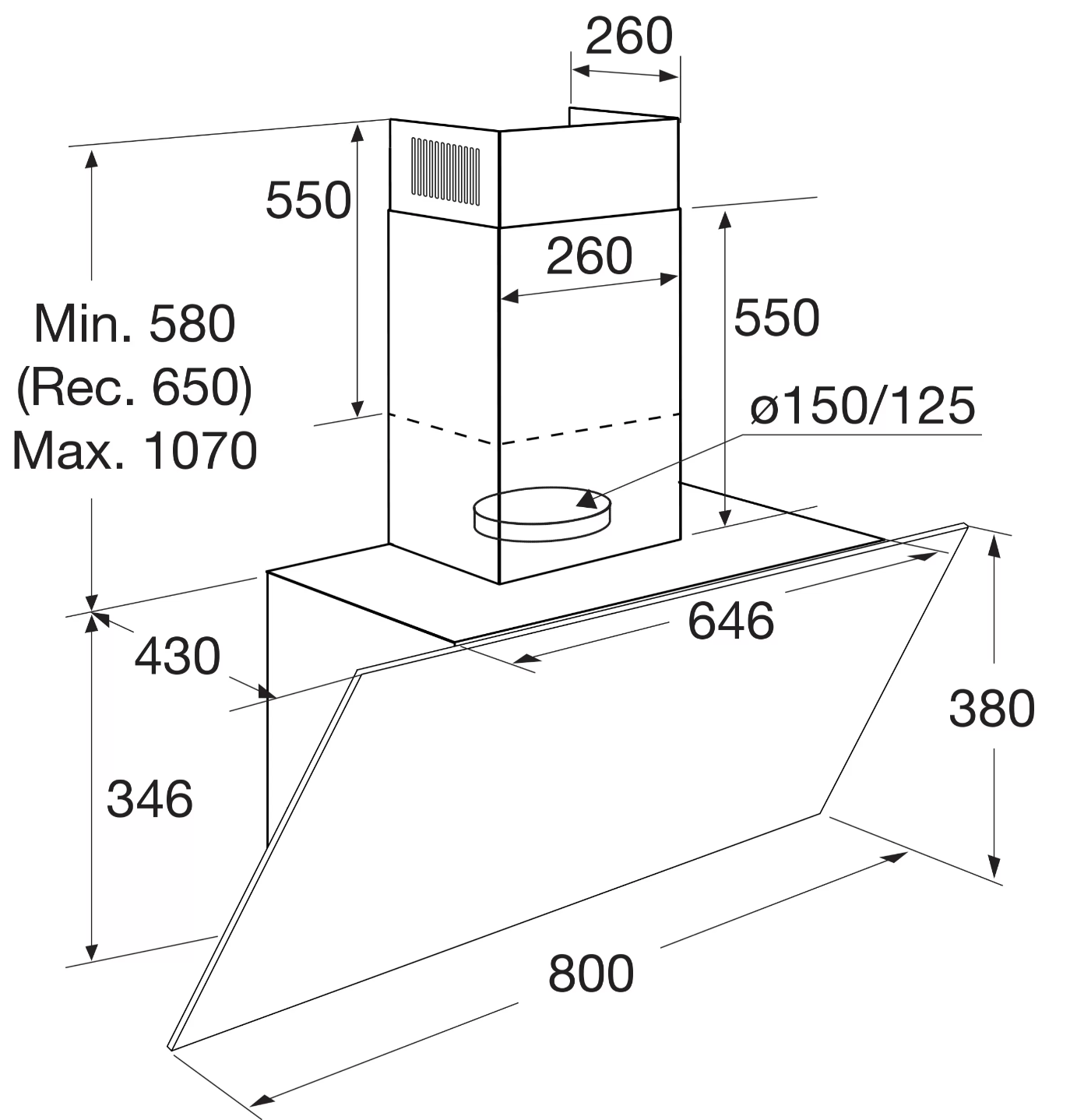 recirculatie afzuigcapaciteit (min/max/int): 225 / 440 / 520 m³/h