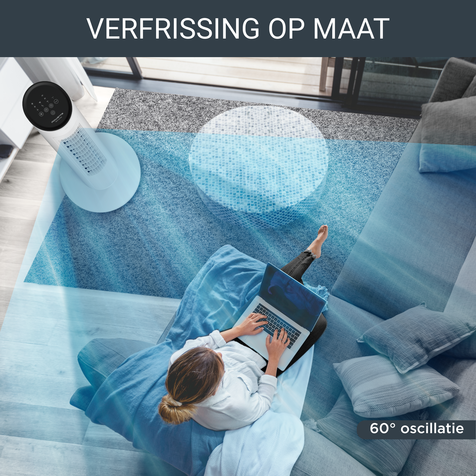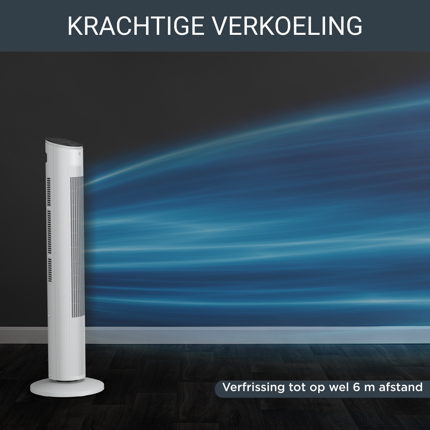 Ontdek een krachtige verfrissing die je in stilte kunt voelen, tot op 6 m afstand. De Eole Ultra torenventilator combineert uitstekende prestaties met een strak, elegant ontwerp dat meer dan 1 m hoog is, voor een ruime luchtverspreiding in de ruimte. Deze gebruiksvriendelijke ventilator is perfect voor ongestoord gebruik tijdens het lezen, tv kijken of slapen. Hij is uitgerust met meerdere standen die aan je behoeften zijn aangepast, een timer om geld te besparen, en een handige afstandsbediening. Alles in een energiezuinig ontwerp!